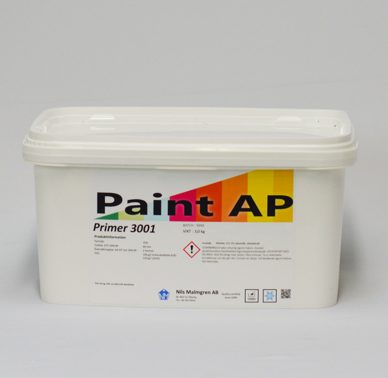 Paint AP Primer 3001 är enkomponent och har fördelen att en stor yta kan strykas utan större tidspress. Torktiden vid 50 % RF och 20°C är ca 60 minuter.